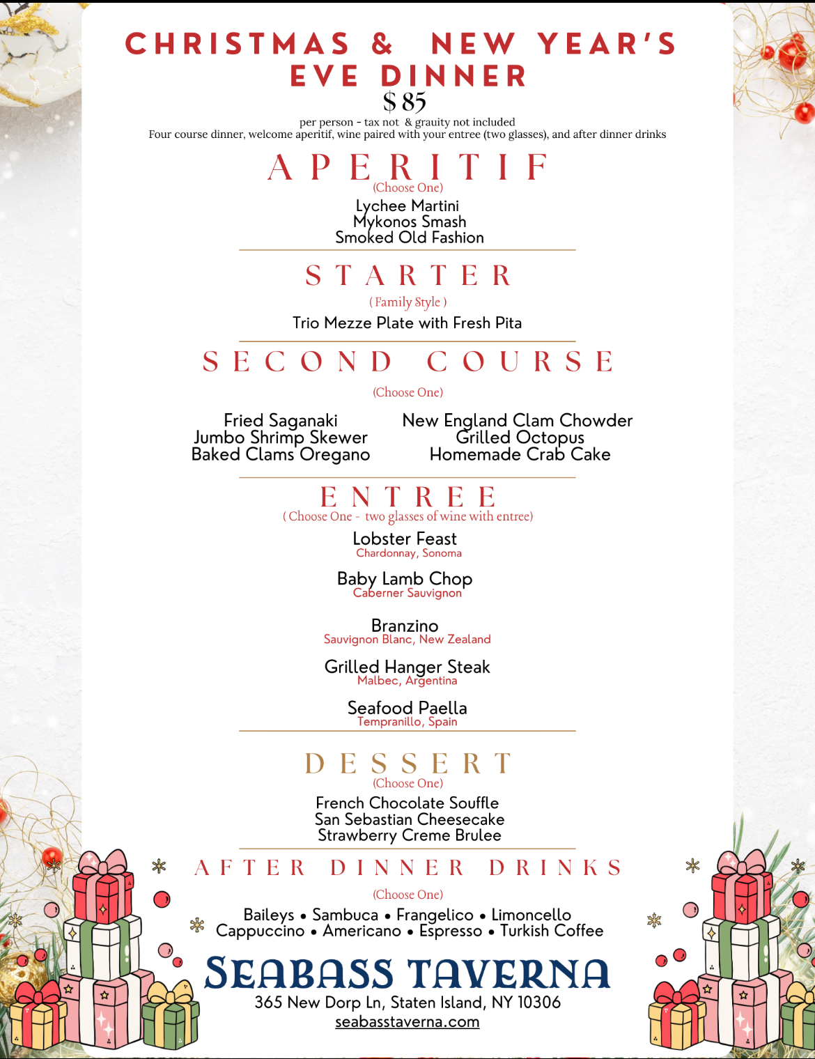 CELEBRATE CHRISTMAS & NEW YEAR'S EVE WITH US AT SEABASS TAVERNA WITH A SPECIAL MENU OR WITH REGULAR MENU